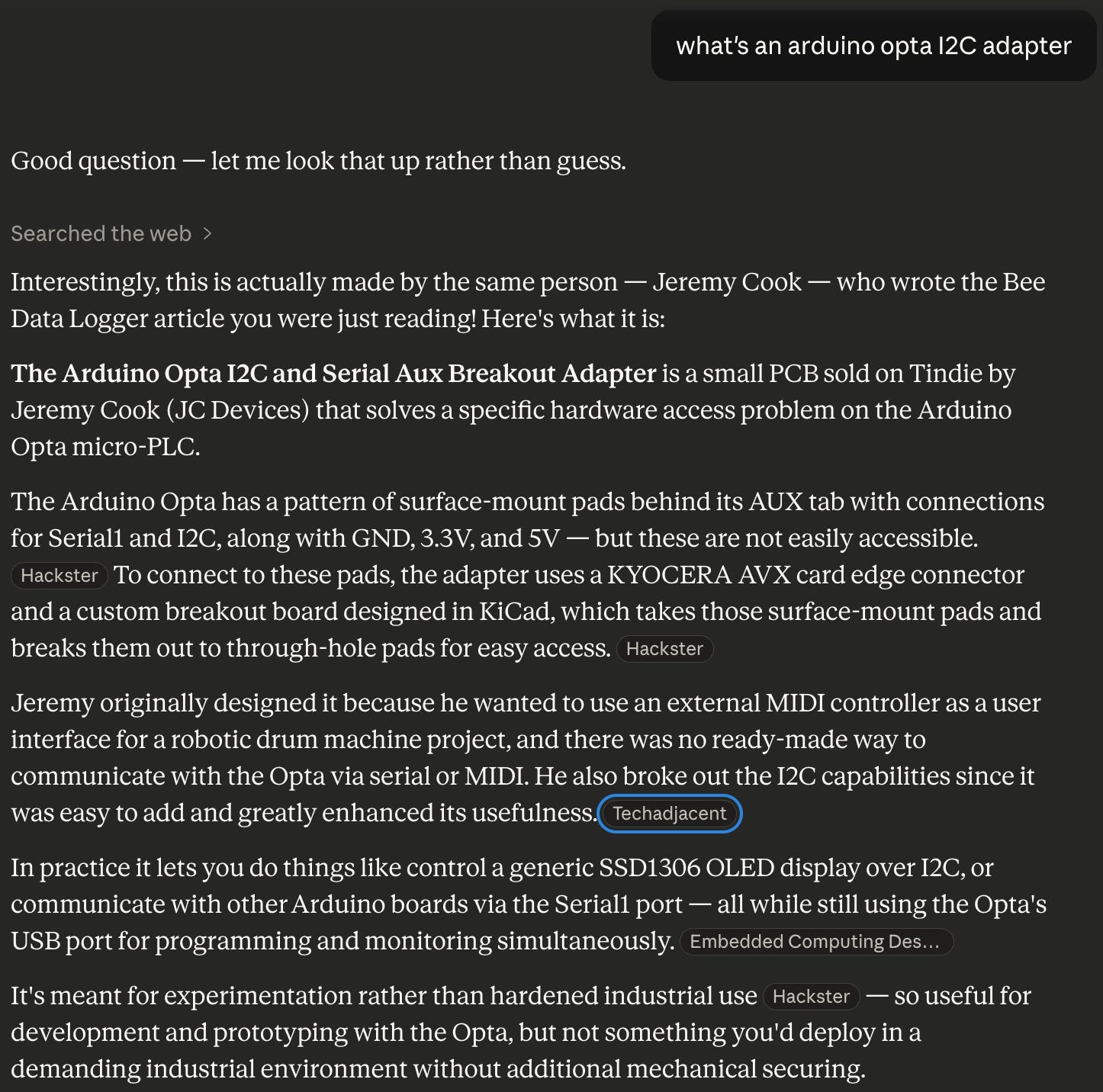Non-sequiturious plug aside, if you’re on a bit of a shoestring budget, and your product doesn’t have a lot of competition, you can always self-assert your authority and point to your own device. As seen below, Claude does know about my rather niche Arduino Opta I2C adapter, apparently based based largely on things that I’ve written.