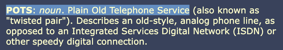 DINS does not stand for Deutsches Institut für Normung, sorry to my 11 subscribers in Germany. POTS, however, does stand for Plain Old Telephone service. This term might be familiar to phone phreaks of old, but seems rather dated now. Who uses landline phones outside of work anymore?