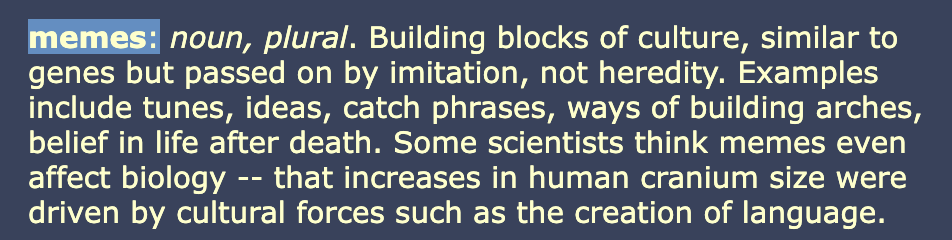 meme: noun, plural. Building blocks of culture, similar to genes but passed on by imitation, not heredity. Examples include tunes, ideas, catch phrases, ways of building arches, belief in life after death. Some scientists think memes even affect biology -- that increases in human cranium size were driven by cultural forces such as the creation of language.