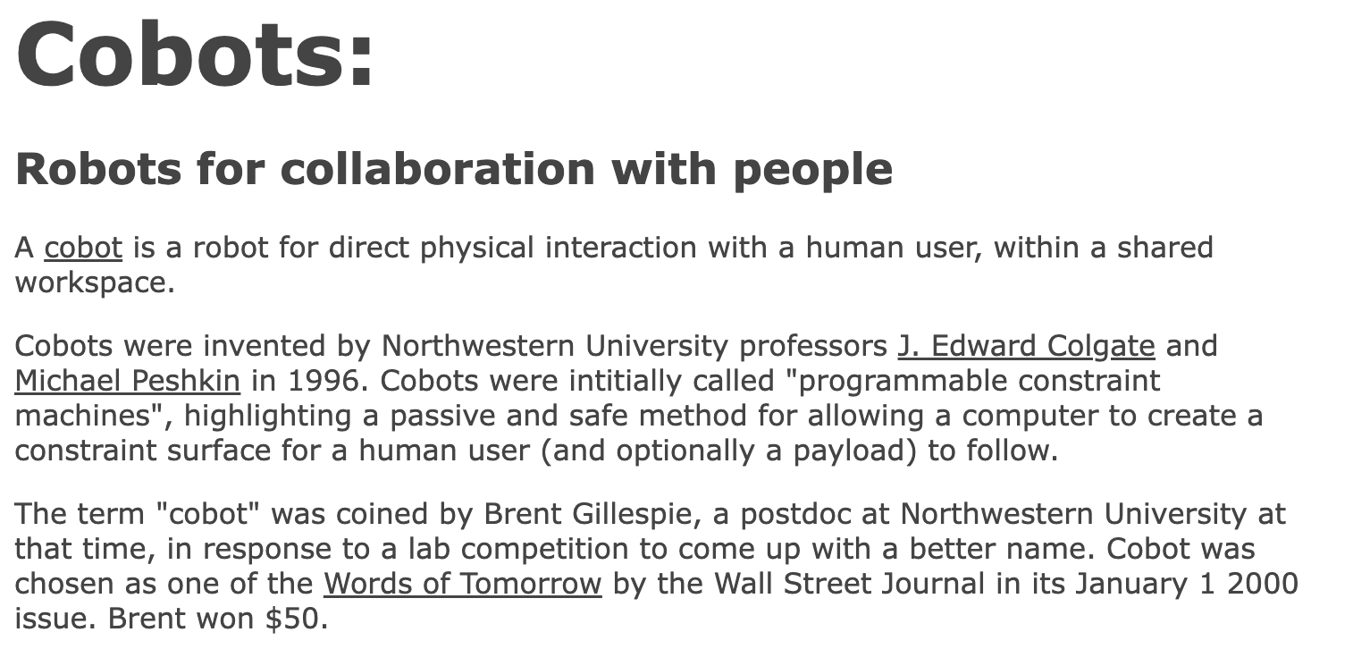 Today I was doing research for a customer piece on Cobots, or collaborative robots meant to work alongside humans, often in industrial settings. These devices, according to the beautifully basic northwestern.edu1 piece shown below, were originally conceived of in 1996 as “programmable constraint machines.”