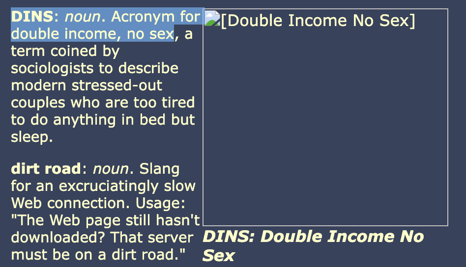 First, the terms: anacronym, cellie, cobot, cred, DINS, dirt road, EGD, embedded ubiquitous computing, emergent, 404, Frankenfood, girlcott, homepreneur, hourglass mode, identity theft, infowar, keyboard plaque, keypal, memes, mobile server, mouse potato, open, optical computer, optionaire, Outernet, pagejack, percussive maintenance, permalancer, plug-and-play hire, POTS, -scape, searchjack, -sphere, smartsize, smartway, splurgent, time suck, tribal marketing, Turing Test, unified messaging system, uninstall, venture catalyst, venture philanthropy, vertical portal (or vortal), voice-jail system, voice novel