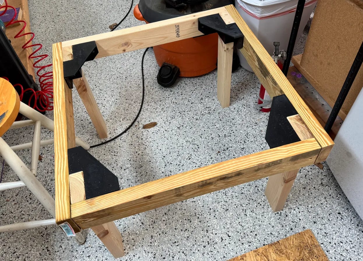 During this process, I used a leftover 3 x 3’ section of OSB for a nice mini table/prototype. This allowed me to test the screw-in-place corner supports on a smaller scale.