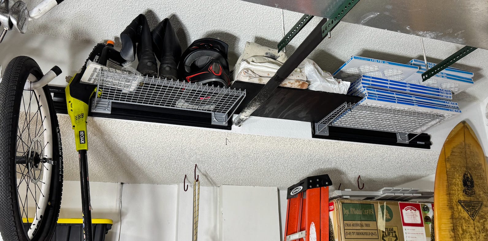 Today I went to Lowes, with the goal1 of getting a few storage shelves that would allow me to take advantage of a rather awkward bit of my overhead garage space. The result, shown below, is two sets of shelves, straddling a drain line from my air conditioner. The bag on the right shelf contains mountain bike parts and gear that I haven’t used for ~5 years or more: