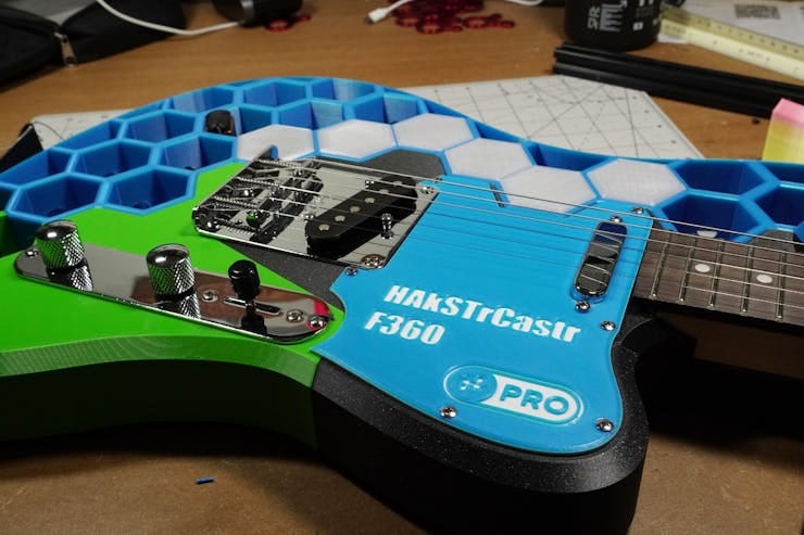 The resulting guitar is shown above, with build details available on Hackster.io (which commissioned this project) and any future mods to be published on Printables. You can even (in theory) mix-and-match parts from the original and my design for something truly unique.